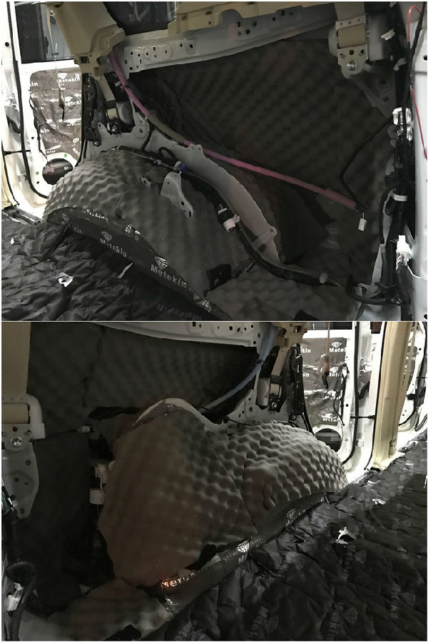 第一步就是解決它的噪音問題,全面性的進行隔音處理,隔音用到材料是美特靜灰鉆減震板+吸音棉+記憶棉。