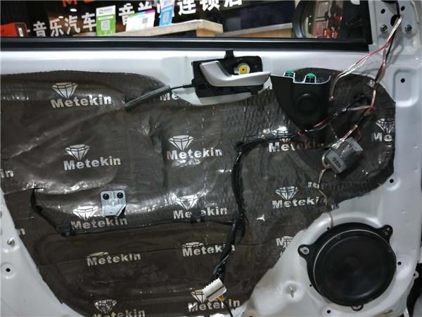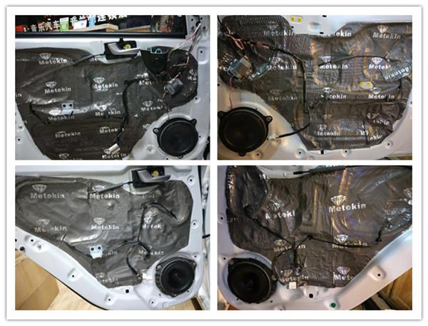 車門做好雙層隔音之后有效降低門板的共振噪音,形成一個類似箱體的構造,可以讓安裝在門板上的中低音喇叭得到更好的效果發(fā)揮,而且用手敲擊車門的時候會感覺到車門變得更厚實。