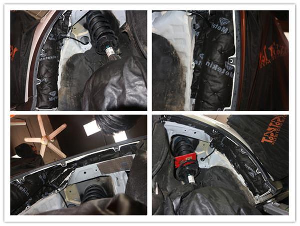 尾箱主要是路噪、胎噪、低頻噪音的主要來(lái)源,所以尾箱隔音第一層安裝美特靜減震板,增強(qiáng)鈑金的厚度。