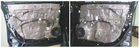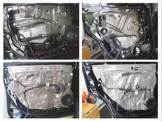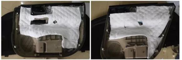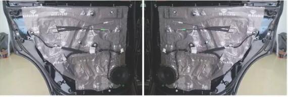 下面開始門板的隔音,技師用兩塊減震板分別鋪滿內(nèi)外門板,隔音施工完畢形成一個(gè)密封的箱體。