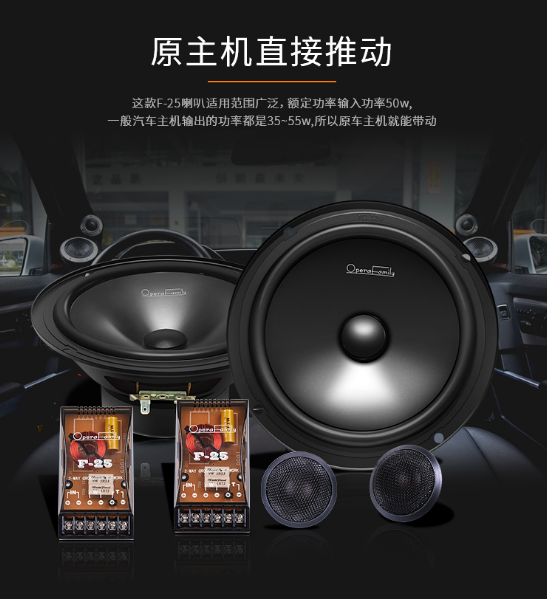 歌劇世家F-25兩分頻套裝喇叭安裝在前聲場,這套喇叭在推出市場后不久就獲得了發(fā)燒友的認(rèn)可,它的中低音沉穩(wěn),高音透亮,而且全部是原位安裝,無損升級,備受青睞!