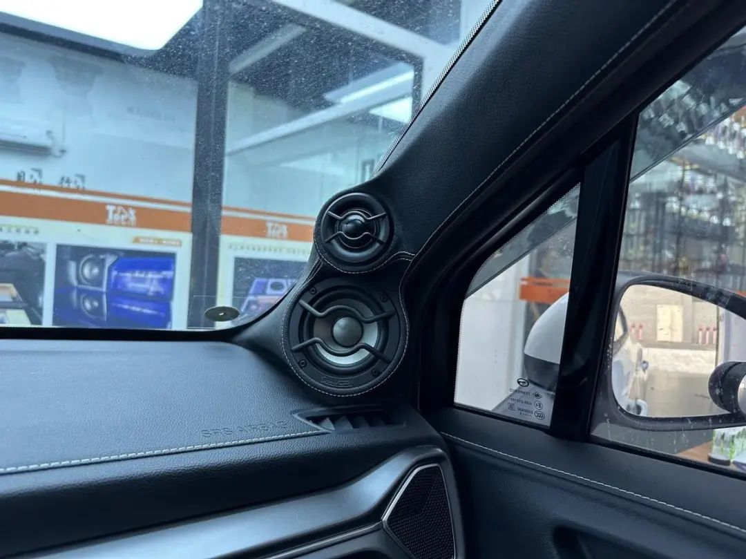 前聲場選擇一套歌劇世家CS 73三分頻套裝喇叭,中音和高音單元通過倒模安裝在A柱上,獲取開闊的聲場,中低音單元安裝在車門原喇叭位,三頻之間相互銜接配合,為車主帶來非常好的聽音體驗(yàn)。