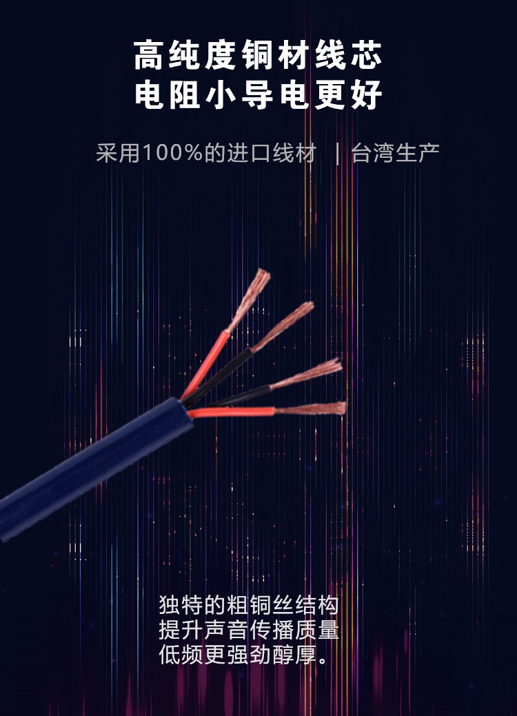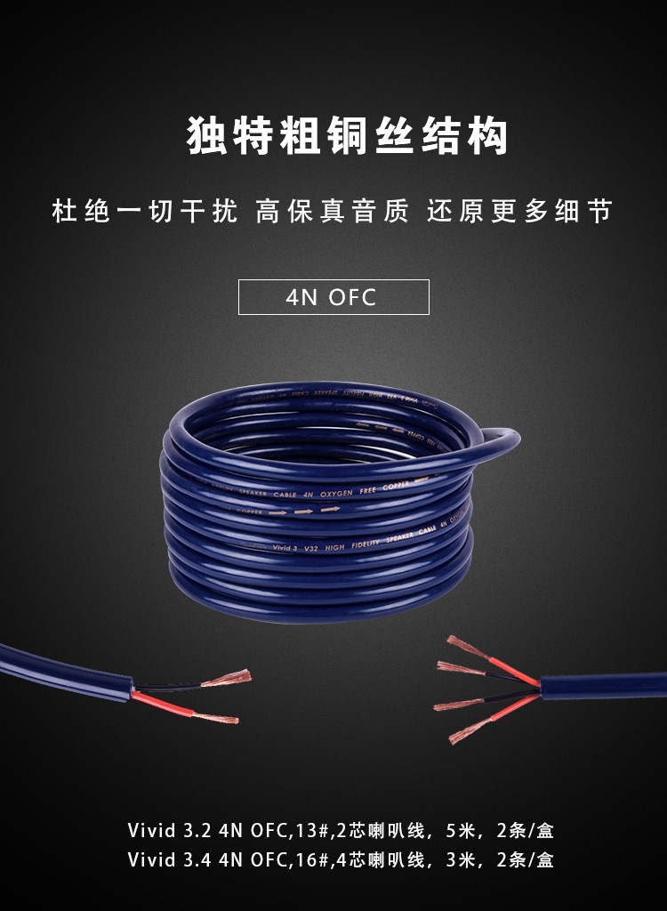 vivid 3.2 4N OFC,13#,2芯喇叭線,5米,2條/盒 vivid3.4 4N OFC,13#,4芯喇叭線,3米,2米/盒 歌劇世家vivid3喇叭線,是100%的線材,4N OFC純銅多股緊密對焦傳輸,保證聲音穩(wěn)定真實的傳輸還原性。高純度銅材線芯,電阻小導電性更好。 獨特粗銅絲結(jié)構(gòu),提升聲音傳播質(zhì)量,低頻更強勁醇厚。 全頻平衡度好,聲音密度質(zhì)感好,還原音樂每個細節(jié)。