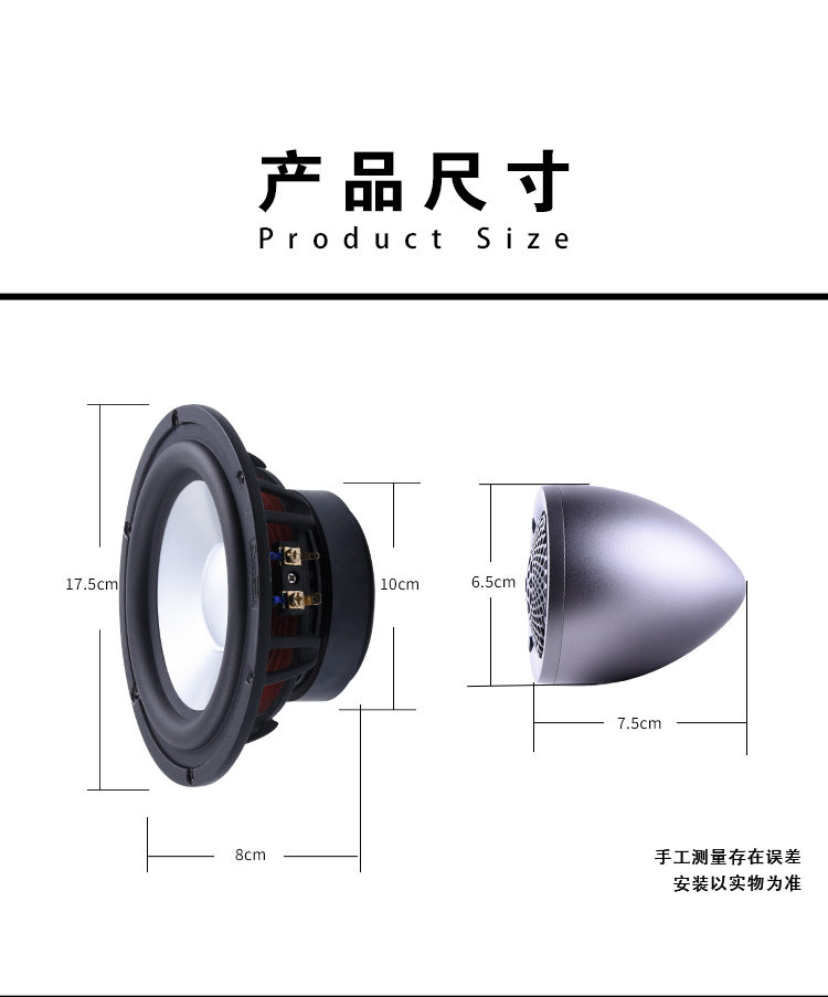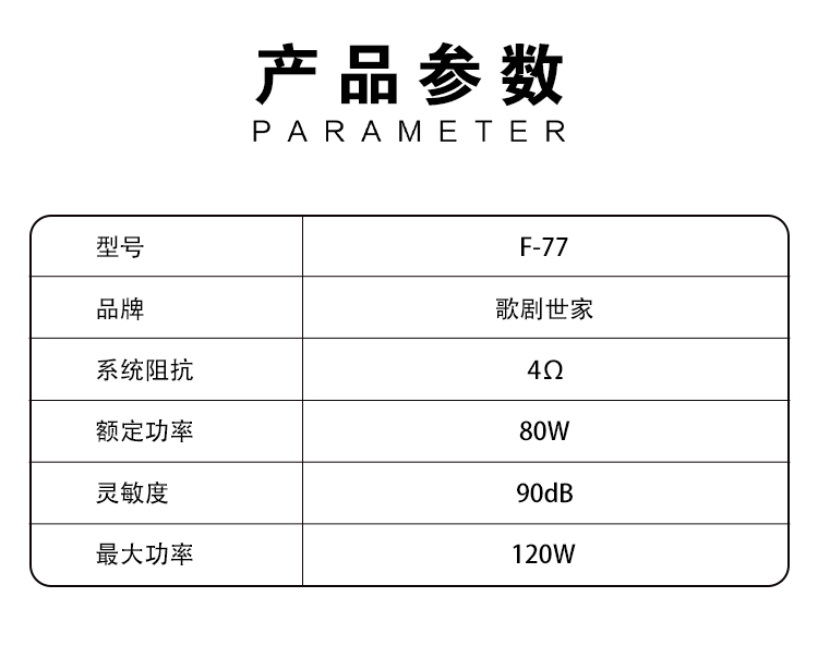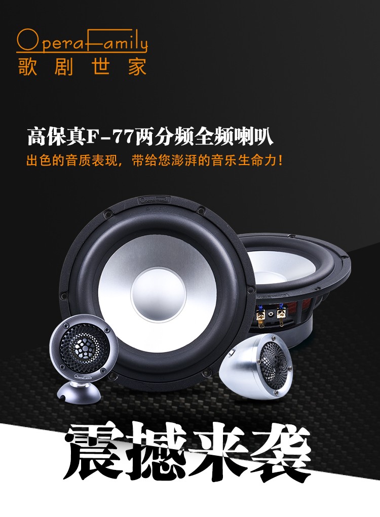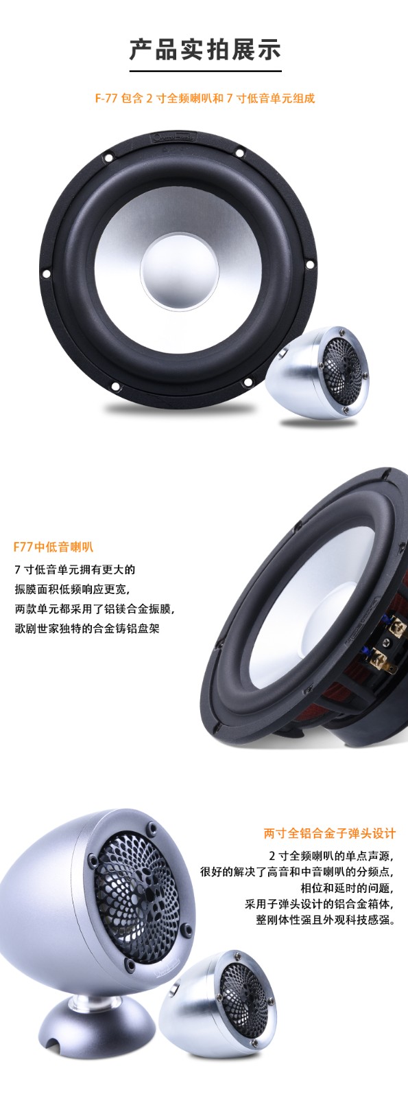 歌劇世家F-77全頻兩分頻喇叭:產(chǎn)品由2寸全頻喇叭和7寸低音單元組成。2寸全頻喇叭單元的單點聲源,很好地解決了高音和中音喇叭的分頻點、相位和延時等問題。全頻喇叭單元則采用了子彈頭設計的鋁合金箱體,整體剛性強且外觀科技感強。7寸低音單元擁有更大的振膜面積,低頻響應更寬。兩款單元都采用了歌劇世家獨家的鋁鎂合金振膜和合金鑄鋁盆架。 產(chǎn)品參數(shù):額定功率:80W / 最大功率:120W / 靈敏度:90dB / 系統(tǒng)阻抗:4Ω