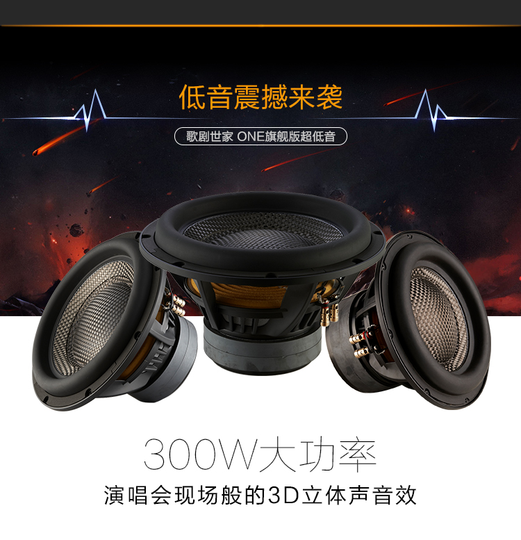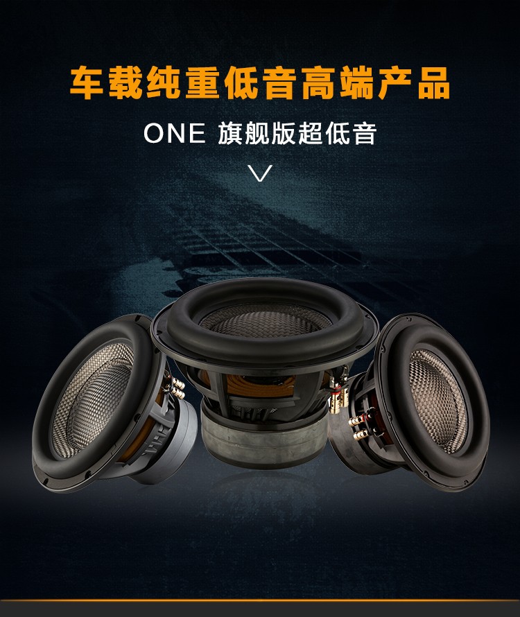 ONE旗艦系列所配置的超低音振膜材料采用純碳纖維材質(zhì),音盆的正反面都涂覆特殊阻尼層,懸邊采用高順性質(zhì)量輕,有著彈性的特殊橡膠,超低音的音圈采用耐高溫材料Black AL+A級純銅繞線組合。