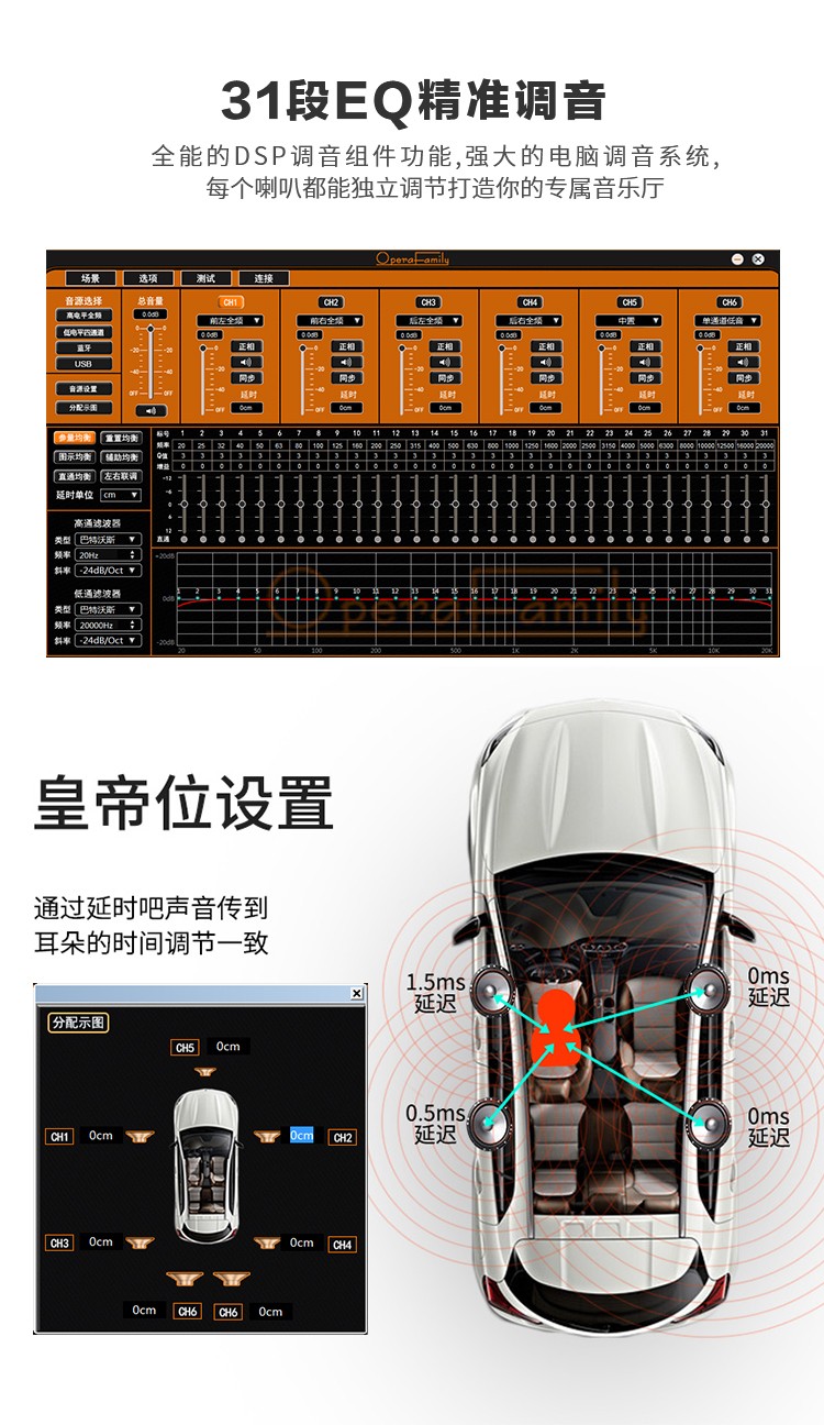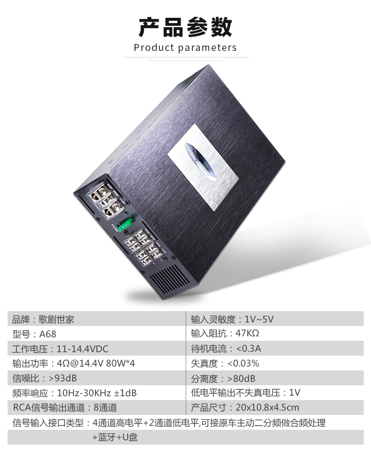 品牌: Opera family/歌劇世家意圖系列 型號: A-68 輸出功率: 其他 輸出阻抗: 4歐姆 失真度: 0.01% 信噪比: 95dBA 汽車音響功放類別: A/B類 汽車音響功放用途: 推套裝喇叭 4進(jìn)6出,31段EQ,延時、藍(lán)牙、4x85W、RMS、A/B類
