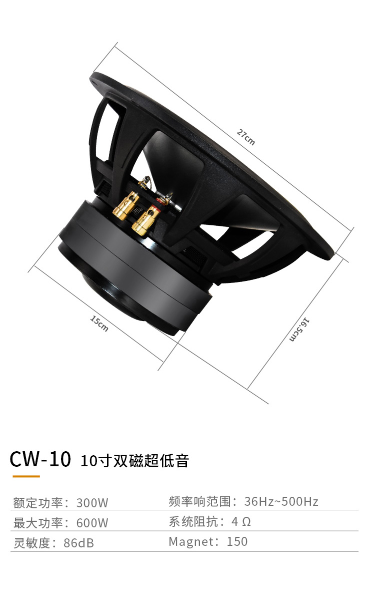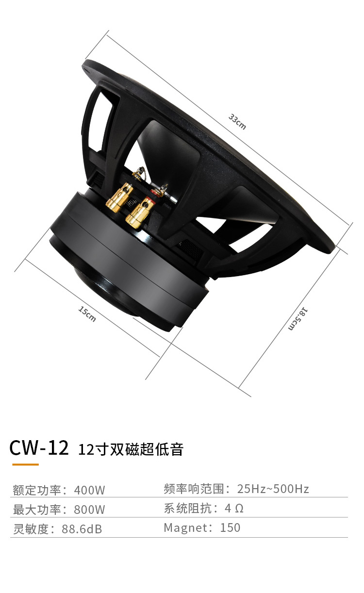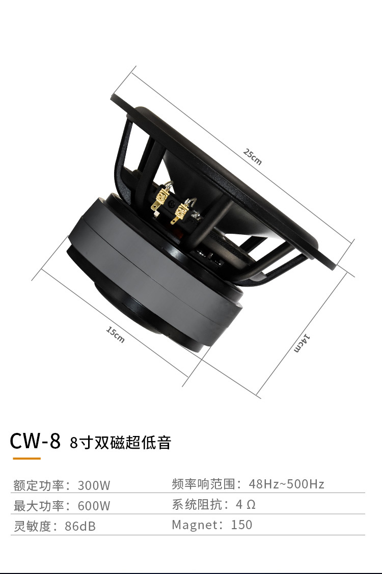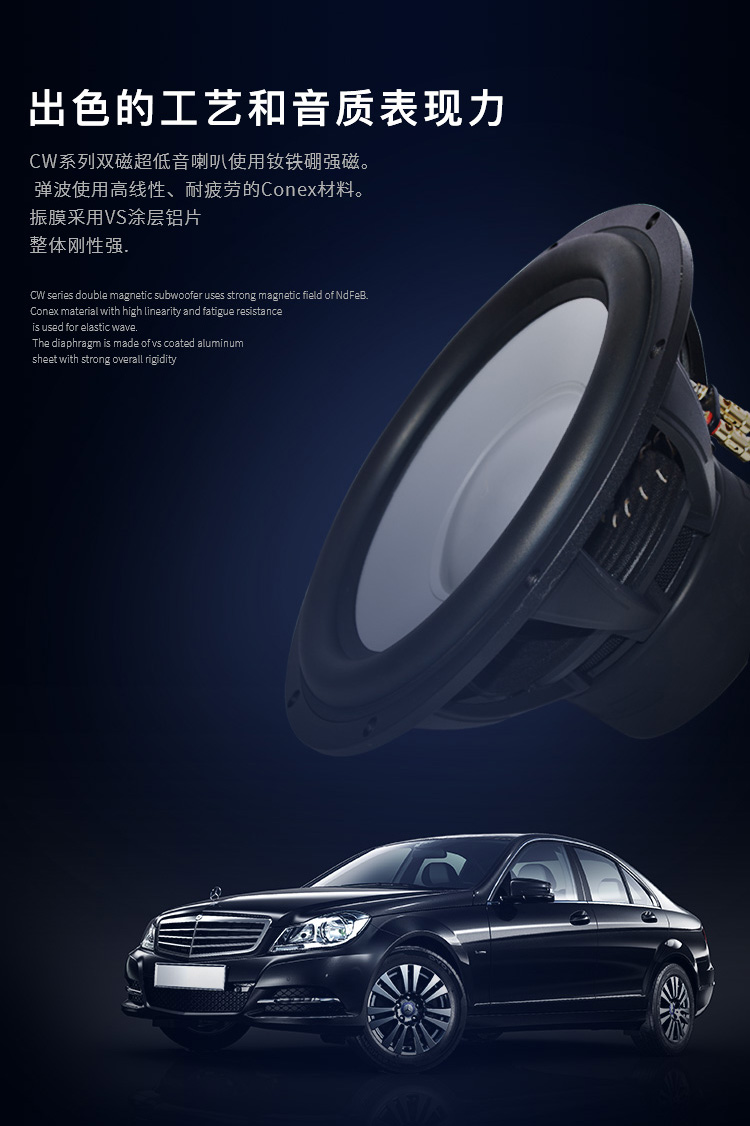 CW-8:8寸雙磁超低音,鋁鎂合金音盤(pán),航空鋁盤(pán)架,300W CW-10:10寸雙磁超低音,鋁鎂合金音盤(pán),航空鋁盤(pán)架,300W CW-12:12寸雙磁超低音,鋁鎂合金音盤(pán),航空鋁盤(pán)架,400W