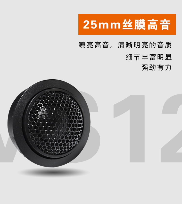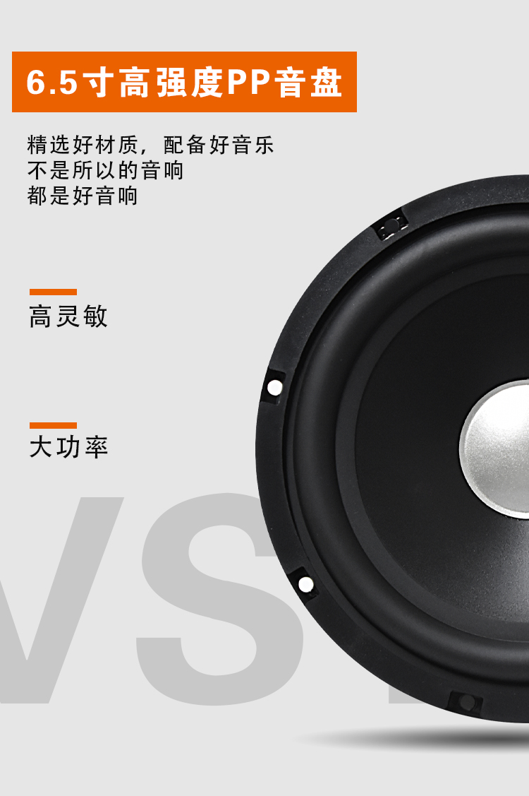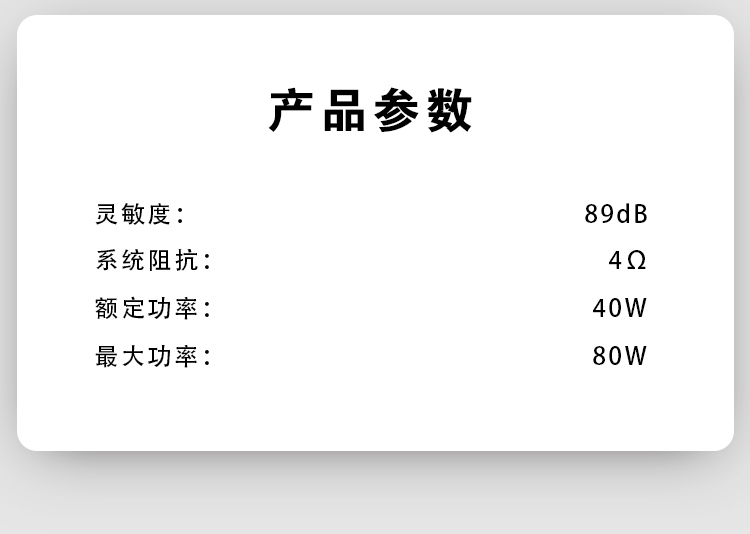 25mm絲膜高音,6.5寸高強度PP音盆,高靈敏度大功率。 額定功率:40W 最大功率:80W 系統(tǒng)阻抗:4Ω 靈敏度:89dB