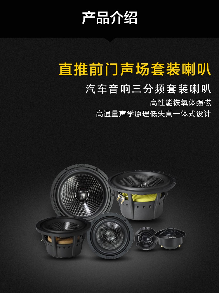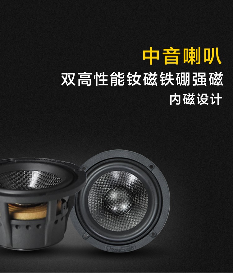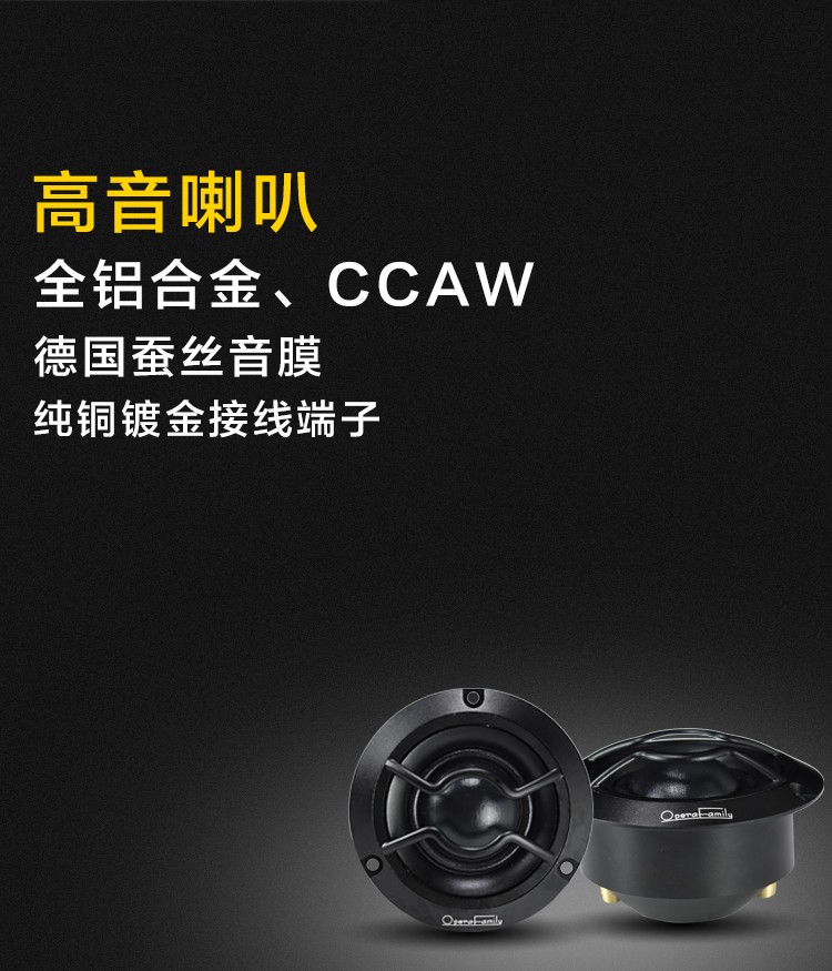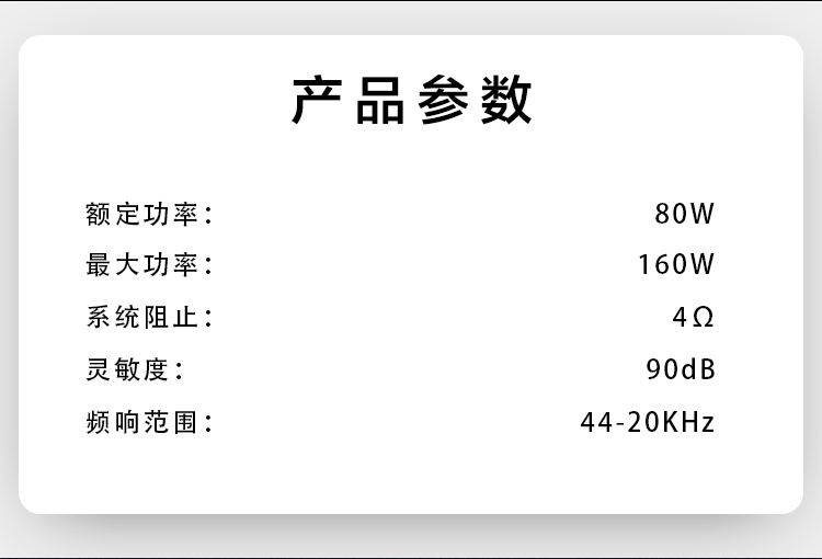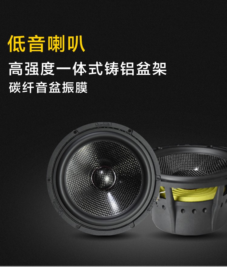 高性能鐵氧體強(qiáng)磁,高通量聲學(xué)原理低失真一體式設(shè)計(jì);高強(qiáng)度一體式鑄鋁盆架,碳纖音盆振膜;雙高性能釹鐵硼強(qiáng)磁,內(nèi)磁設(shè)計(jì);全鋁合金,CCAW,德國蠶絲音膜;純銅鍍金接線端子。 額定功率:80W 最大功率:160W 系統(tǒng)阻抗:4Ω 靈敏度:90dB 頻響范圍:44Hz-20kHz