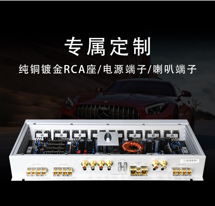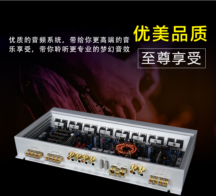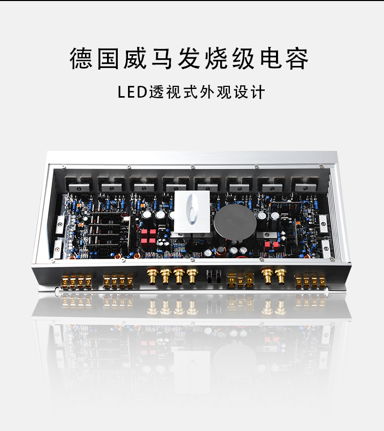 定制純銅鍍金、電源端子、喇叭端子; 德國(guó)威瑪發(fā)燒級(jí)電容; LED透視式外觀設(shè)計(jì); 開關(guān)式輸入增益調(diào)節(jié); 輸入功率:6x100W THD+N:<0.01% 信噪比:>100dB 頻響范圍:10Hz-30kHz 輸入靈敏度:0.5V-4V 輸入阻抗:10kΩ