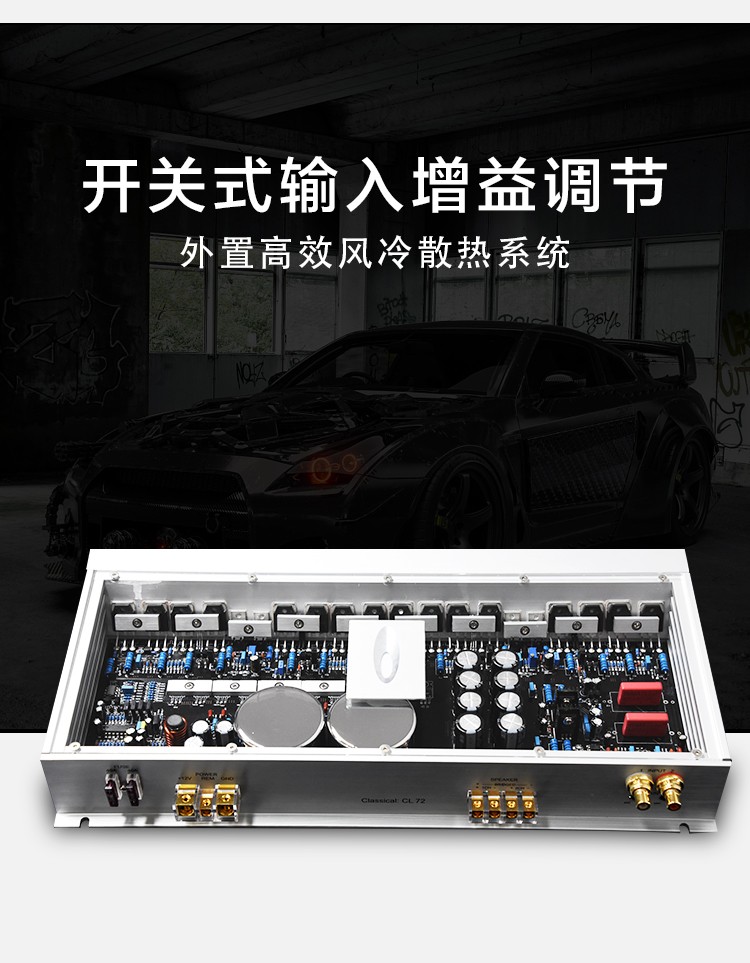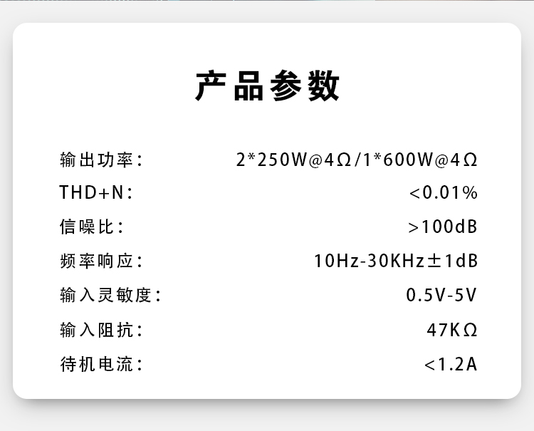 兩組獨(dú)立電源;定制純銅鍍金RCA座、電源端子、喇叭端子;德國(guó)威瑪發(fā)燒級(jí)電容;LED透視式外觀設(shè)計(jì);開關(guān)式輸入增益調(diào)節(jié);外置高效風(fēng)冷散熱系統(tǒng)。 輸入功率:2x250W@4歐姆/1x600W@4歐姆 THD+N:<0.01% 信噪比:>100dB 頻響范圍:10Hz-30kHz±1dB 輸入靈敏度:0.5V-5V 輸入阻抗:47KΩ 待機(jī)電流:<1.2A