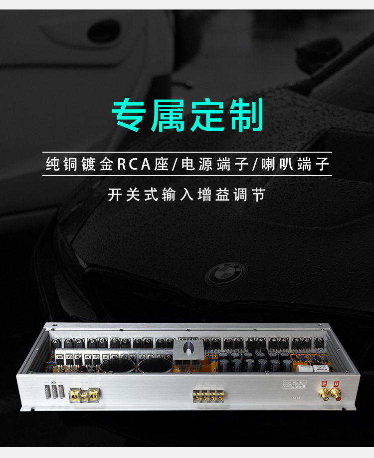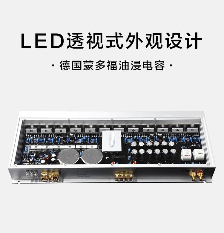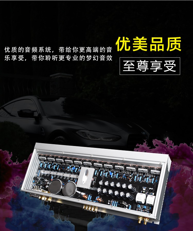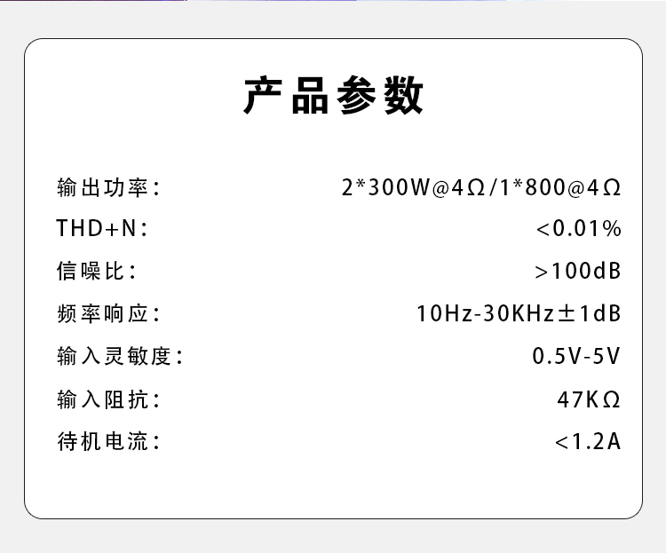 雙單聲道式設(shè)計(jì);定制純銅鍍金RCA座、電源端子、喇叭端子;德國(guó)蒙多福油浸電容;LED透視式外觀設(shè)計(jì);開(kāi)關(guān)式輸入增益調(diào)節(jié);外置高效風(fēng)冷散熱系統(tǒng)。 輸入功率:2x300W@4Ω/1x800W@4Ω THD+N:<0.01% 信噪比:>100dB 頻響范圍:10Hz-30KHz±1dB 輸入靈敏性:0.5V-5V 輸入阻抗:47kΩ 待機(jī)電流:<1.2A