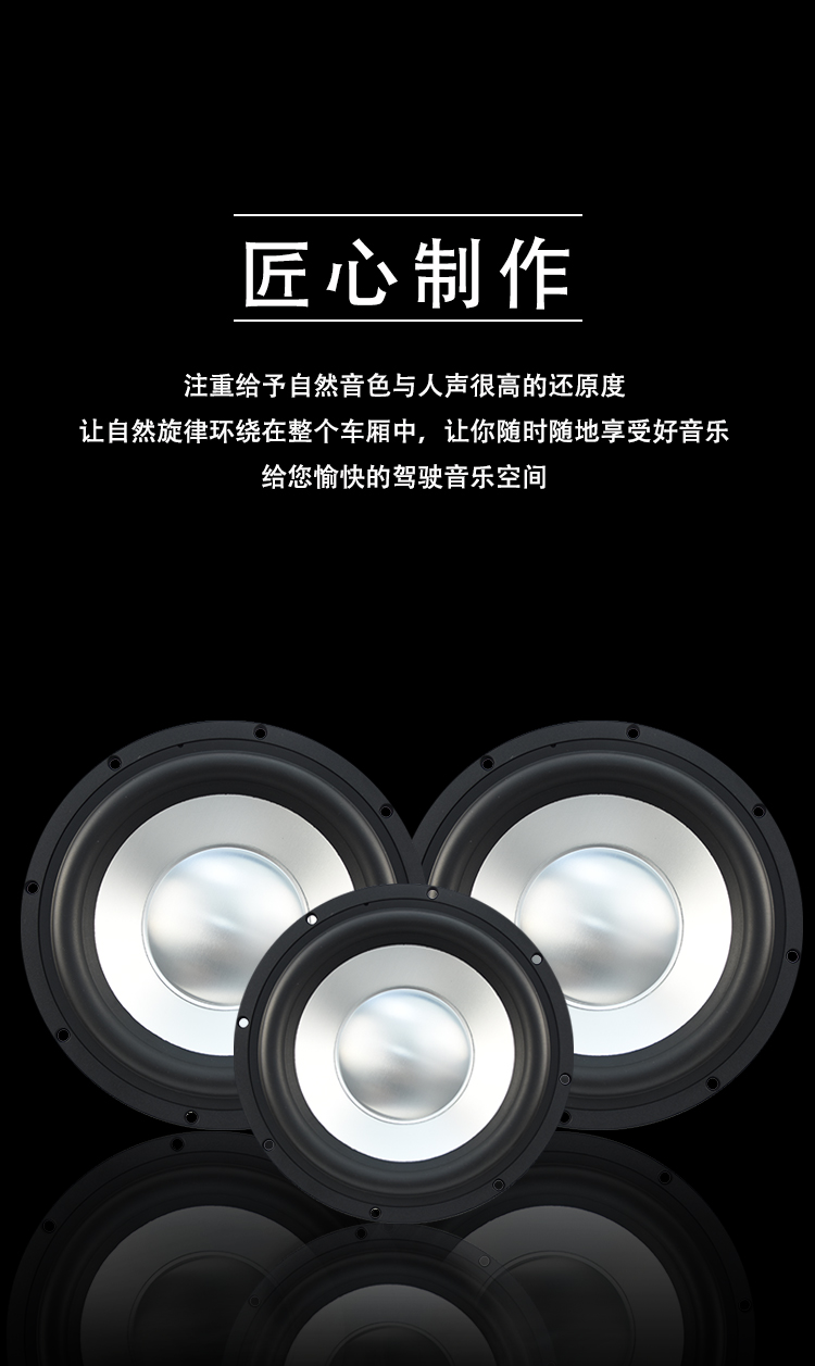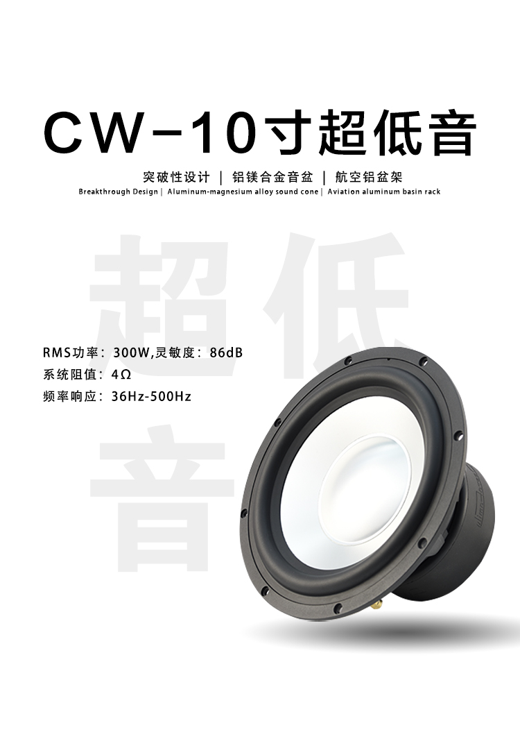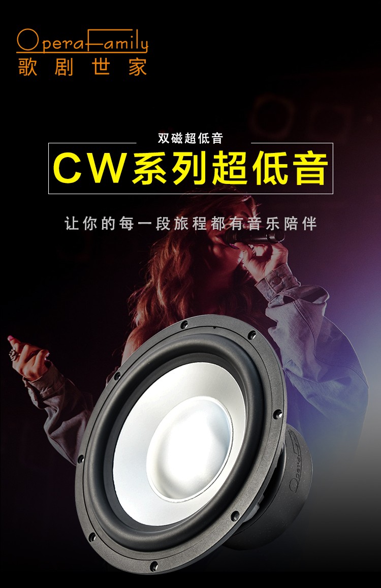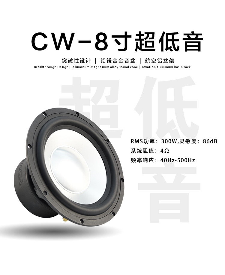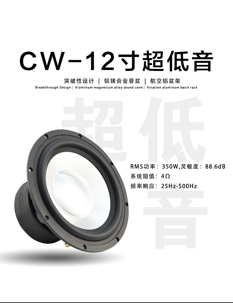 CW-8:Fo(Hz):48 / RMS功率:300W / 靈敏度:86dB / 系統(tǒng)阻抗:4Ω / 頻率響應(yīng):40Hz-500Hz CW-10:Fo(Hz):36 / RMS功率:300W / 靈敏度:86dB / 系統(tǒng)阻抗:4Ω / 頻率響應(yīng):36Hz-500Hz CW-12:Fo(Hz):25/ RMS功率:300W / 靈敏度:88.6dB / 系統(tǒng)阻抗:4Ω / 頻率響應(yīng):25Hz-500Hz 歌劇世家八寸、十寸、十二寸雙磁超低音,鋁鎂合金音盆,航空鋁盤(pán)架。